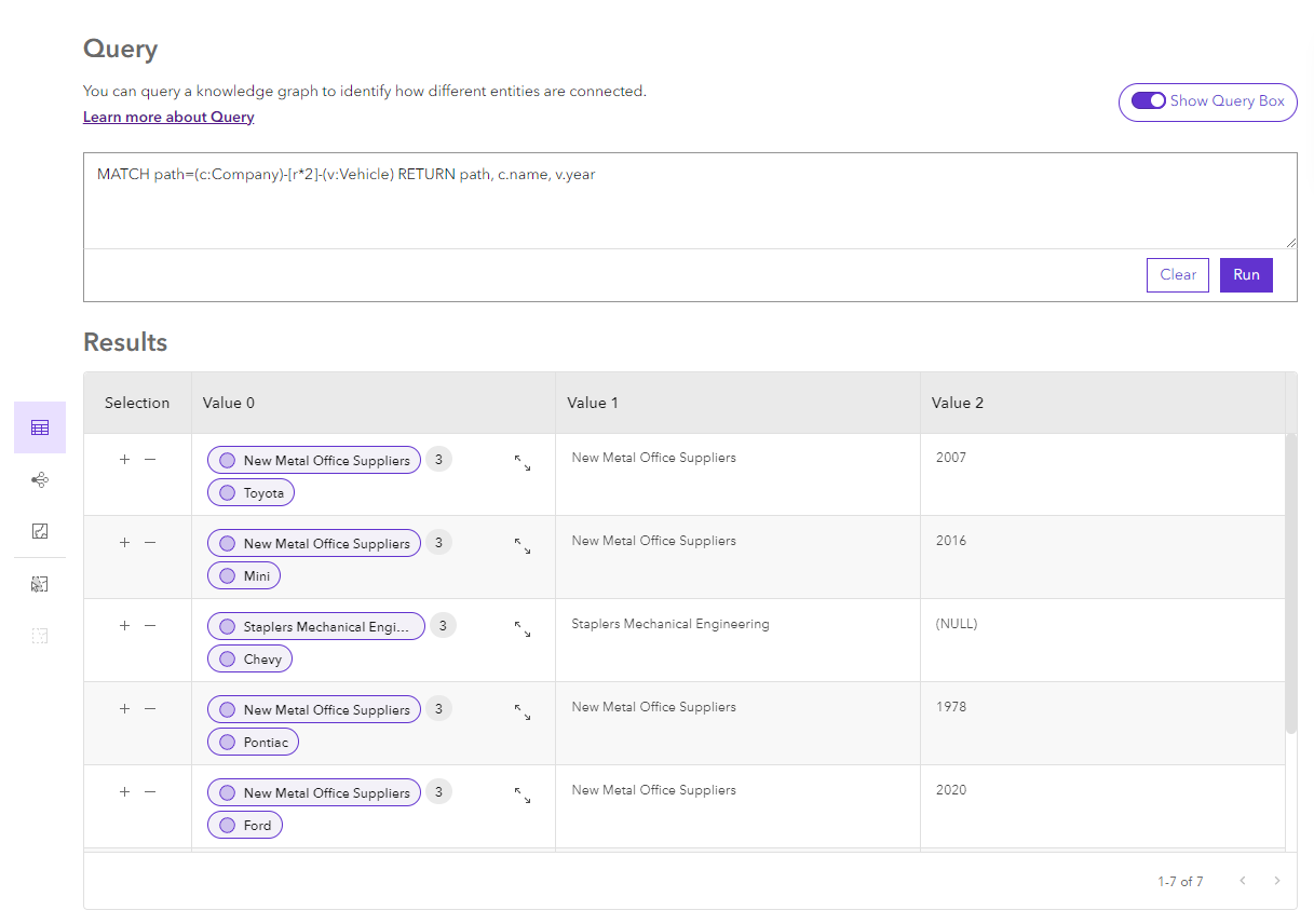 Paths can include any number of entities and relationships. For example, a query such as MATCH path=(c:Company)-[r*2]-(v:Vehicle) RETURN path will return all paths between Company entities and Vehicle entities that are exactly two relationships away. Each path will contain the origin Company entity, each intermediary entity and relationship, and the destination Vehicle entity. The query results table will display the path in the Value 0 column. By default, it will just display the origin entity and destination entity in the path and the total number of records in the path. Click the Expand expand query rows to view the full path result.